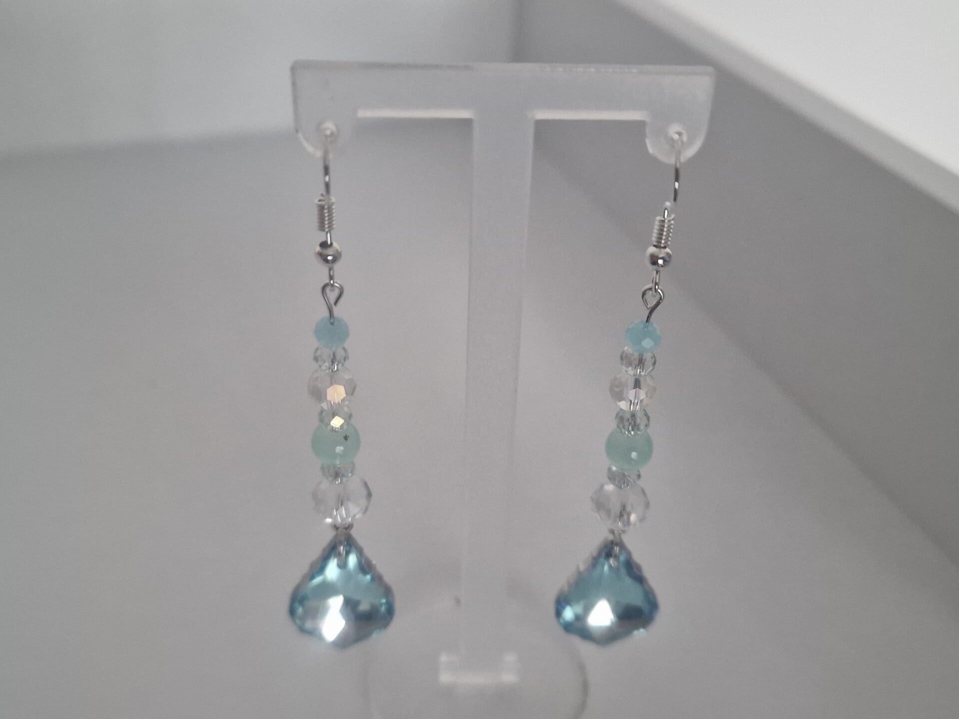 Délicates et lumineuses, ces boucles d’oreilles sont composées de perles en verre et d’une goutte en verre cristal facetté qui capte joliment la lumière.