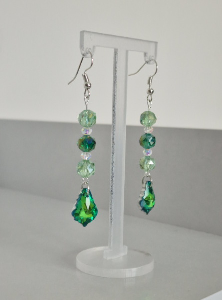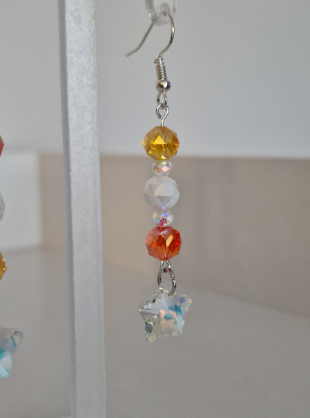 Délicates et lumineuses, ces boucles d’oreilles sont composées de perles en verre et de pampilles en verre cristal facetté qui capte joliment la lumière avec des reflets de plusieurs couleurs.